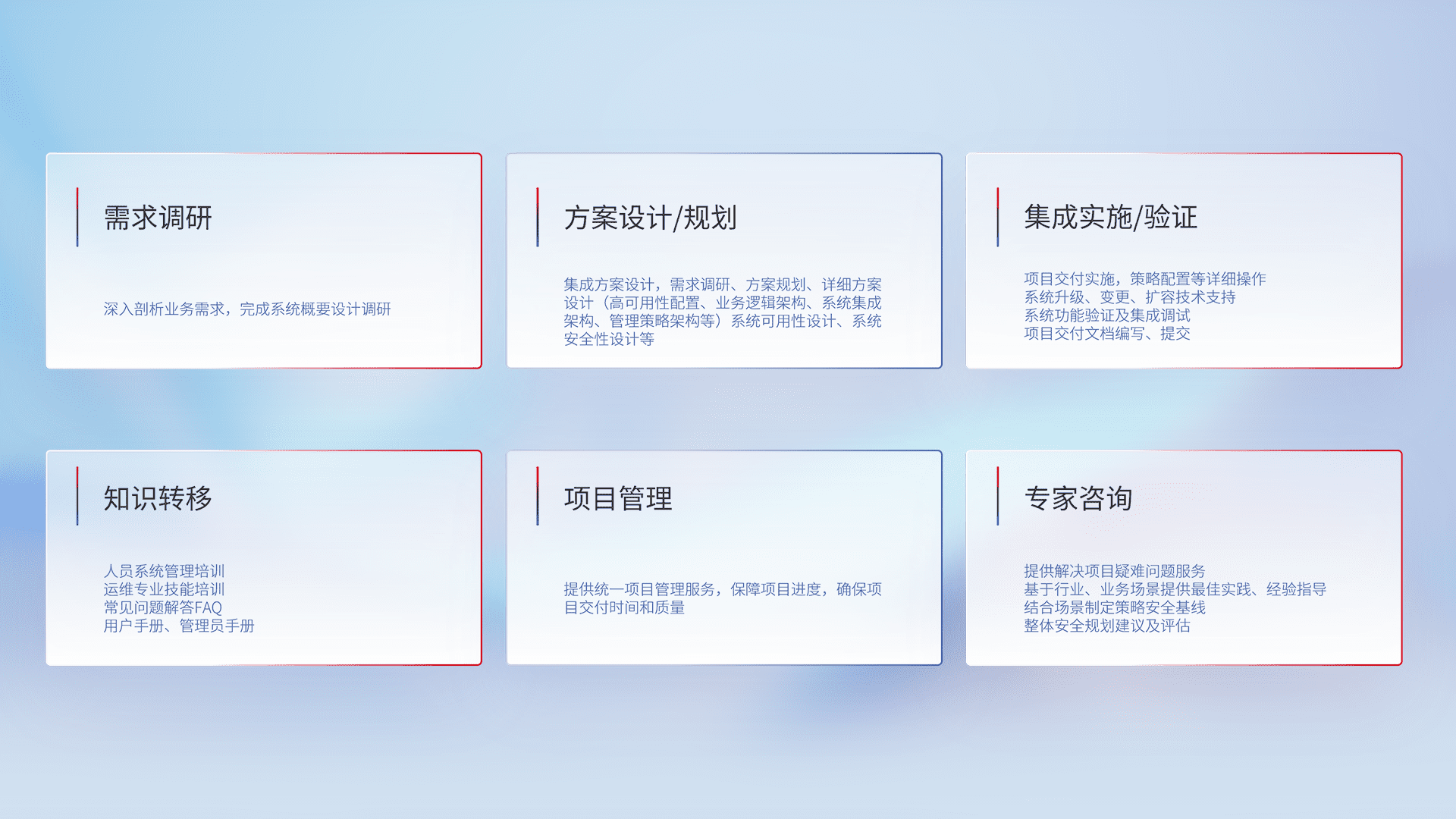 针对客户行业特性,,,将宏观的安全战略和需求,,通过专业的交付服务,,,实现项目落地,,,,为客户提供标准规范的集成交付服务。。。